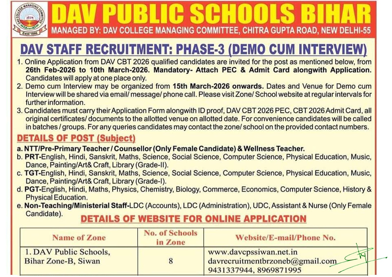 DAV Staff Recruitment: Phase-3 (Demo cum Interview) Notice